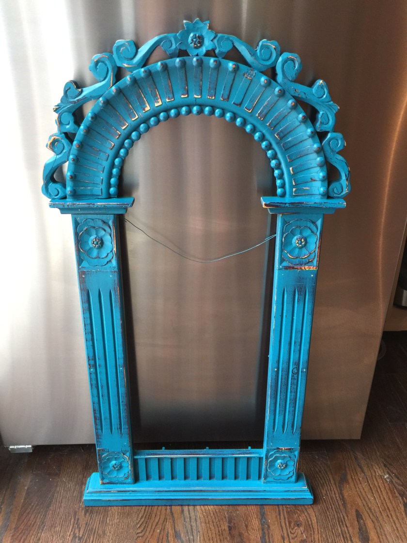 I saw this mirror on Restoration Hardware’s website and decided to upgrade my mirror to look similar.How it looked originally…A couple coats of spray paint and sandpaper distressing and this is how it turned out. I like it!And this cool ornate mirror always reminded me of Indonesian style…But after adding vibrant Turquoise paint and some distressing, it became this fun tribal artifact.My garden boxes look great and are flourishing in their new space on the shed. However, the water runs straight through the basket and ends up on the ground. I decided to use these old galvanized buckets as planters to catch the recycled water and brighten up the area below the garden baskets.