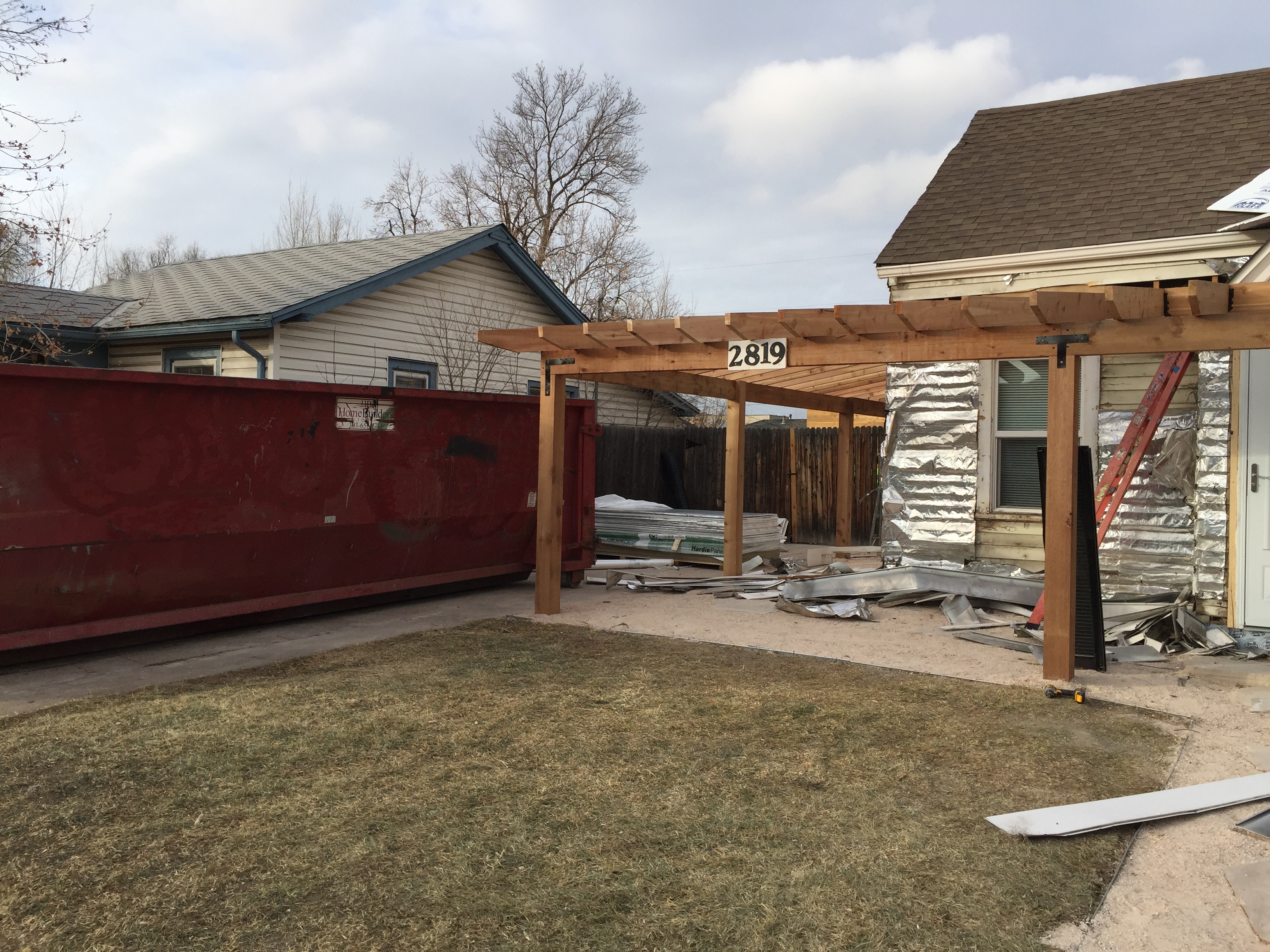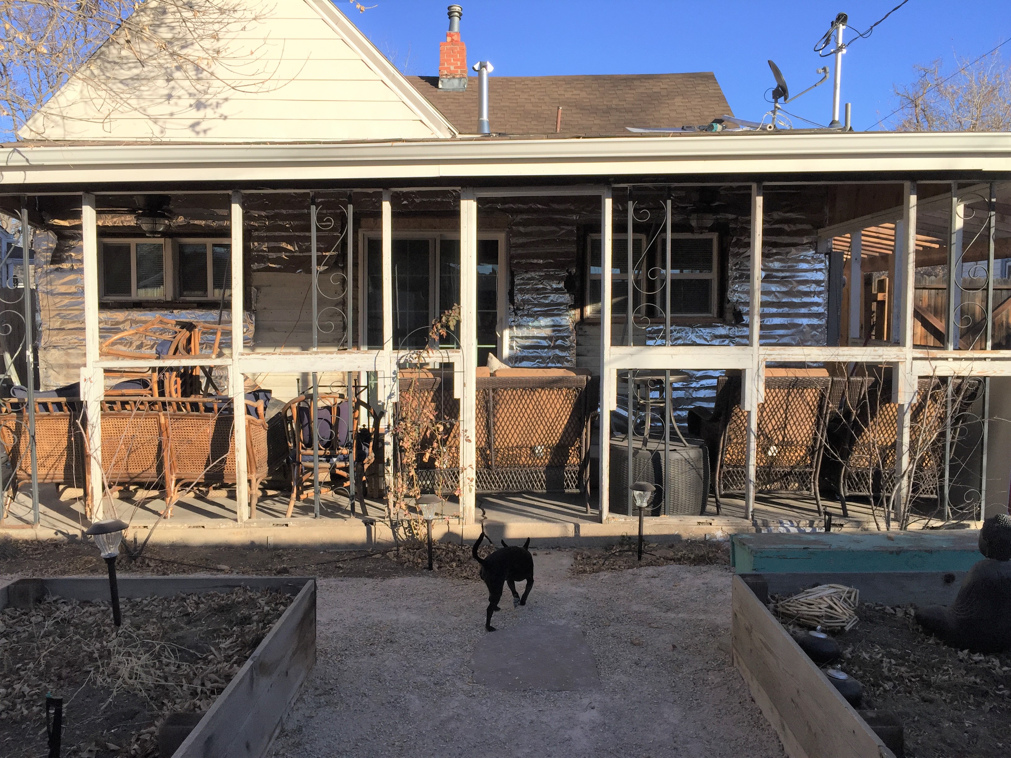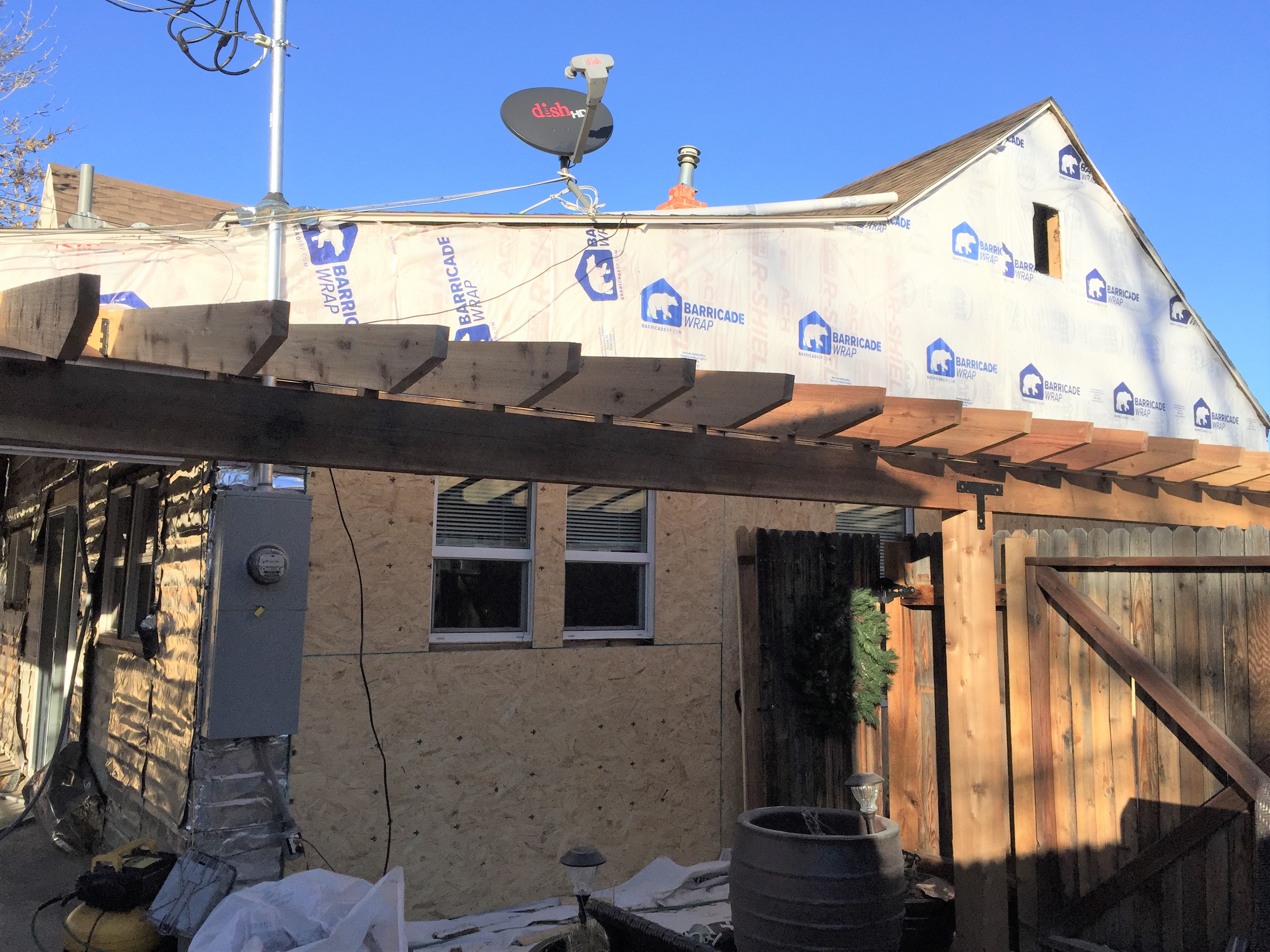 They tear off the vinyl siding, exposing the original wood siding underneath. I decided to have them add a layer of insulation and sheets of plywood to better insulate and stabilize the whole house. Then, the new siding will go on top.