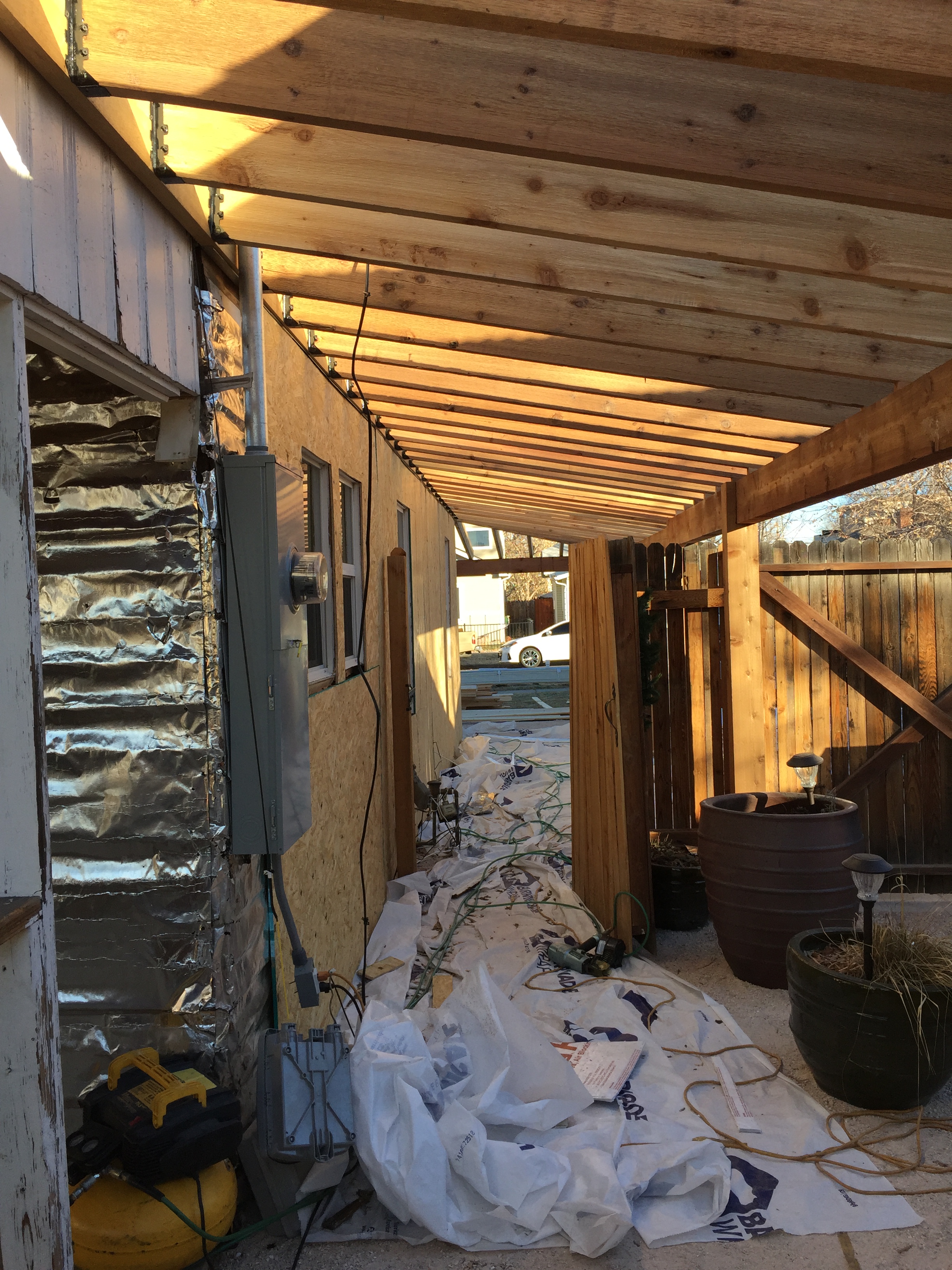 I plan to use James Hardie Board and Batten siding on the bottom of the house and horizontal Cedar planks on the gables and wrapped around the front entry. The Board and Batten will get painted White and I’ll leave the cedar unfinished. In time, the natural patina of unfinished Cedar will turn Grey, giving the house a rustic look. I hope to be done with this phase by the end of next week.